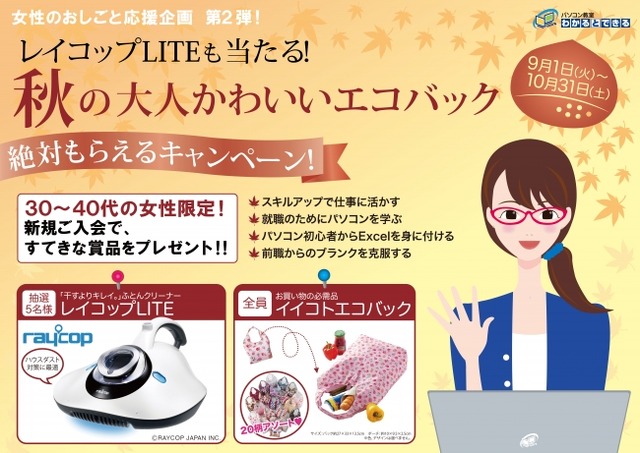 株式会社わかるとできる(以下:わかるとできる)が運営する「パソコン教室わかるとできる」にて、30~40代の女性の就業を応援する『女性のおしごと応援企画 第2弾』を開催します。2015年9月1日(火)~10月31日(土)の期間中、「パソコン教室わかるとできる」に新規ご入会された方全員に「大人かわいいエコバック」をプレゼント、さらに抽選で5名様に「レイコップLITE」をプレゼントします。