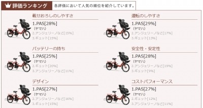 各項目で、ヤマハの『PAS』シリーズが1位に。20年以上前から電動アシスト自転車を販売している、老舗メーカーだけに、知名度では頭ひとつ抜けていました。「バイクも作っているので安心感がある」(31歳女性、お子さん0歳)というコメントも目立ちました。