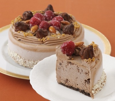 が調和する、本格的なアイスチョコケーキに仕上げました。上面に飾った、キャラメルで包んだアーモンドの香ばしさとトリュフチョコのなめらかな口どけ、ラズベリーの酸味がアクセントになっています。