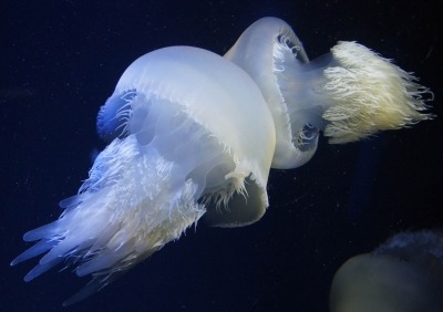 スナイロクラゲは、カサの直径が30cmほどになる大型のクラゲで、青みがかったカサと白いヒゲのような細かい触手が特徴です。九州から東北地方まで広く分布し、鴨川周辺の海にも毎年夏の終わりから秋にかけて暖かい黒潮に乗ってやってきます。また、活発にカサを動かして泳ぐスナイロクラゲは肉質がかたく、食用クラゲの高級種としても知られています。