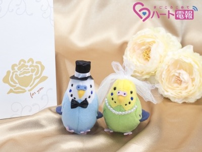 ウェディング姿のセキセイインコのぬいぐるみ付きのお祝い電報が新発売!