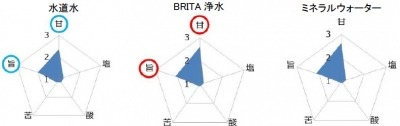 ○分析対象 : 水道水、BRITAでろ過した水道水、ミネラルウォーター(国産)