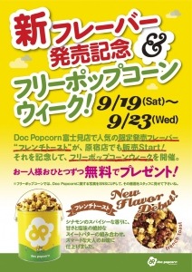 Doc popcornでは、毎月第一日曜日にポップコーンを無料でプレゼントする「フリーボップコーンデー」を行っております。今回、新フレーバーの発売を記念して、シルバーウィークの9月19日(土)から9月23日(水・祝) の5日間、原宿店と富士見店にて「フリーポップコーンウィーク」を開催いたします。今回無料で提供するフレーバーは、新フレーバーのフレンチトーストです。