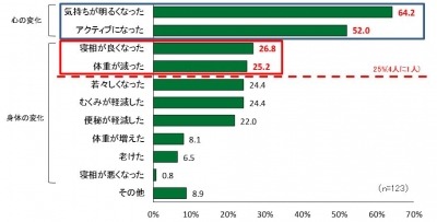 その結果、実践した腰痛軽減方法で効果あった人のうち4人に1人が、腰痛が軽減した後に「体重が減った(25.2%)」、「寝相が良くなった(26.8%)」、さらに「気持ちが明るくなった(64.2%)」など身体の変化も感じていることが明らかになりました。
