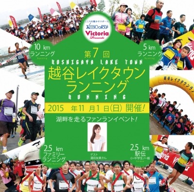 ゼビオグループである、(株)ヴィクトリア(本社 東京都千代田区)が主催する越谷レイクタウンランニングは、ランニング初心者でも気軽に挑戦できるフラット湖畔周遊コースになっております。実力派ランナーが猛スピードで駆け抜ける10Kmラン、ヨットが浮かぶ湖のほとりを気持ちよく走る5Kmラン、親子の絆が微笑ましいファミリーラン、そして感動と笑顔いっぱいの小中学生駅伝。多彩なエントリーができるランニングイベントです。アディダスランニングアドバイザー湯田友美さんをゲストに迎えて参加ランナーと伴走していただきます。会場内では、野菜直売所などの屋台も出店し、和気あいあいとしたランニングイベントを盛り上げます。
