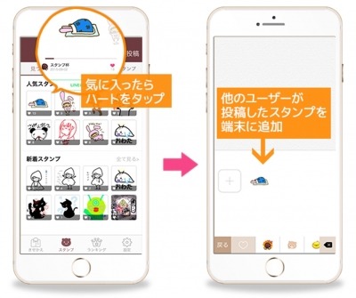 キーボードに追加:お気に入りのスタンプをタップすることでSNSに送信できることも可能。さらにハートマークをタップするとキーボードに追加可能です。