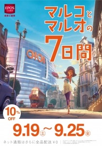 株式会社丸井(本社:東京都中野区、取締役社長:中村正雄)は、シルバーウィークを迎える9月19日(土)~25日(金)までの7日間、マルイ店舗および外部専門店、ネット通販サイト「マルイウェブチャネル」にて、エポスカード会員ご優待キャンペーン「マルコとマルオの7日間」を開催いたします。期間中、エポスカードのクレジットをご利用いただくと、「マルイ」でのお買物が10%OFFでご利用いただけます。
