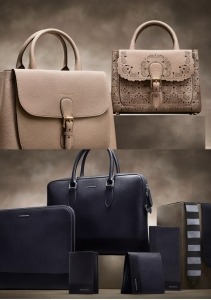 メンズ: 左から ドキュメントケース ¥155,000 「バロウ・バッグ」 ¥260,000 カードケース ¥41,000 ウォレット ¥52,000 ロングウォレット ¥52,000 (全て税抜、予定価格)