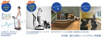 体組成測定器「InBody」、3次元加速度振動マシン「POWER PLATE」を新規導入し、より充実した健康管理を可能にしました。その他各種トレーニング機器を更新、フロントカウンター・休憩ラウンジ等各所の美装を行い会員様にはもちろん、これから健康的な生活を始めたいとお考えの方にご利用いただきたい施設に生まれ変わります。