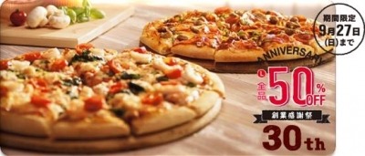株式会社ドミノ・ピザ ジャパン(代表取締役社長:スコット・オルカー/本社:東京都千代田区、以下ドミノ・ピザ)が展開する、日本で最初のデリバリーピザチェーンドミノ・ピザは日本上陸30周年を迎えます。同時に、全国400店舗突破となることを記念し、2015年9月19日(土)~9月27日(日)までの期間限定で、ネット注文でLサイズ全品が半額となる「ドミノ・ピザ 30周年 創業感謝祭」を実施いたします。