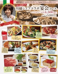 白木屋・魚民・笑笑などを展開する株式会社モンテローザ(本社 東京都武蔵野市 代表取締役 大神輝博)は、平成27年11月1日(日)~平成28年1月31日(日)までの期間限定で、9業態、1,826店舗において、年末年始にふさわしいスペシャルな料理が楽しめる「川越シェフコラボ 宴会コース」の販売を開始いたします。