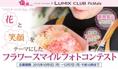 パナソニック株式会社は、フラワーギフト通販の「イイハナ・ドットコム」(株式会社 千趣会イイハナ)とのコラボレーションで、無料クラウド写真サービス「LUMIX CLUB PicMate」において、「花と笑顔をテーマにしたフラワースマイルフォトコンテスト」を、2015年10月5日(月)~12月7日(月)まで開催します。
