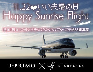 プリモ・ジャパン株式会社が運営するブライダルジュエリー専門店「アイプリモ」と、株式会社スターフライヤーは、2015年11月22日(日)※、様々な良縁のスポットとして知られる出雲大社上空で日の出を見る「11.22(ハート)いい夫婦の日 Happy Sunrise Flight」を開催いたします。