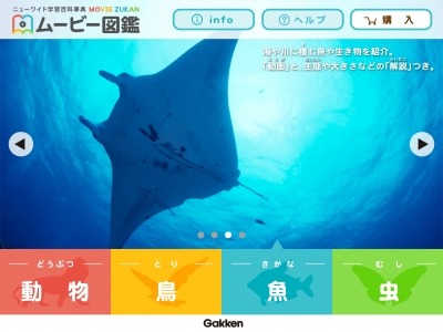 本アプリは、生き物のようすをムービーで観察できる図鑑アプリです。「動物」「鳥」「魚」「虫」の4種類の図鑑、全 325 種類の生き物が収録されています。おなじみの生き物から珍しいものまで、生き物たちの動くすがたをお楽しみください。