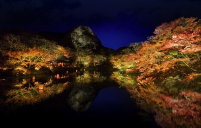 夜間の紅葉ライトアップは11月7日(土)~11月29日(日)までの23日間に渡り行います。庭園各所を周回できるよう散策路を明りで照らすことで、池泉回遊式庭園ならではの紅葉狩りをお楽しみいただけます。ライトアップエリアは庭園上部「樹齢170年の大モミジ」までエリア拡大を行い昨年約30,000坪(99,000m2 )のスケールでしたが、今年は更にライトアップエリアを拡大。約40,000坪(132,000m2 )と日本最大級の庭園ライトアップを更に拡大し皆様にお愉しみいただけるスケールとなりました。