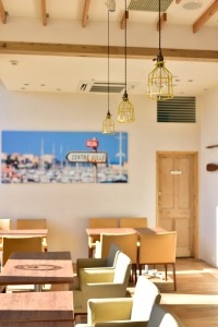 ビーチをイメージさせる大型写真パネルやボートのオールをディスプレイし、鎌倉のビーチサイドの雰囲気を演出しています。CAFE全体はナチュラルな雰囲気ですが、黄色いペンダントライトをアクセントとして配置し、さわやかで活気のある印象に仕上げました。