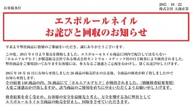 この度、2015年8月より発売を開始しました、「エスポルール」ブランドのネイル商品に国内で配合してはならない「ホルムアルデヒド」が製造販売会社である株式会社セントラル・メディック社の自主検査により検出されました。弊社商品をご愛用頂いておりますお客様には、多大なるご迷惑とご心配をおかけし、深くお詫び申し上げます。2015年10月16日にお知らせ致しました26商品の販売停止の公表後、全商品の検査が終了致しましたので