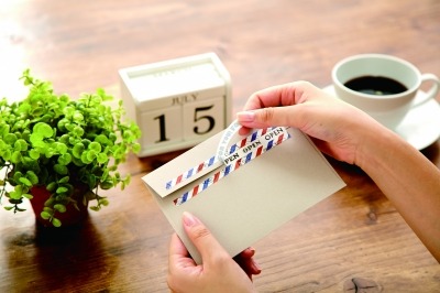 テープの真ん中にミシン目を入れているので、そこから簡単に封を開けることができ、封筒をやぶらずきれいに開封できるスグレモノです。第1弾では片側からしかめくることができませんでしたが、今回はミシン目を改良し、左右どちらからでも開けられるようになりました。