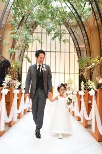 2015年10月18日(日)、2階ロビーのチャペル「ルミネール」では、お父さんの豊様(36歳)が『私 豊は、娘 朋子を妻 恵と共に一生涯愛し、どんな時も守り抜き、幸せにすることを誓います』と誓いの言葉を述べると、白いドレス姿の朋子ちゃん(5歳)も『私は、大きくなってもずっとパパを大好きでいることを誓います』と元気に宣誓。誓いのキスの後は、オリエンタルホテル 東京ベイが婚姻届製作所とコラボレーションして作成したオリジナルデザインの結婚届に署名をすると、ご列席の親族からは祝福の拍手がおくられました。