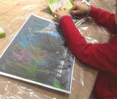 浅草のアートプロジェクトビルHATCHで個展開催中の夜光写真家、山下晃伸が撮影した公園の動物や恐竜のオブジェの写真にイメージを広げ、塗り絵をしながら、オリジナルの絵を完成させるワークショップです。