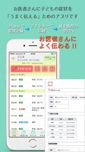 iPhoneで症状や経過を簡単に記録でき、家庭のプリンターで印刷、病院の受付時に紙を提出することで、家庭での状態、体温グラフ、看病や経過の様子、便や発疹などの写真、アレルギーなどのプロフィール、聞きたいこと等、医師に適切に伝えることができます。