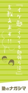 塾のナガシマは、「イケ勉」を「1.イケてる勉強方法:塾のナガシマが提唱する4つの勉強方法であり、やればやるほど効果が出るスマートな勉強方法。2.イケてる上に勉強もできるヤツ:塾のナガシマが提唱する4つの勉強方法を実行することにより到達できる、誰もが「こうなりたい!」と憧れる存在。」であると定義します。「イケ勉」の対義語は「ガリ勉:成績をあげるために、他のことには目もくれずがむしゃらに勉強すること。もしくはそれをする人。(三省堂『大辞林』より一部引用 )」です。