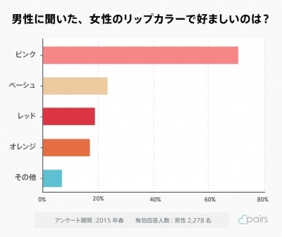 Facebookを利用した恋愛・婚活マッチングサービス「pairs(ペアーズ)」( http://www.pairs.lv/)では、「pairs」の男性会員を対象に「好ましい女性のリップカラー」についてアンケート調査を実施しましたので、発表いたします。