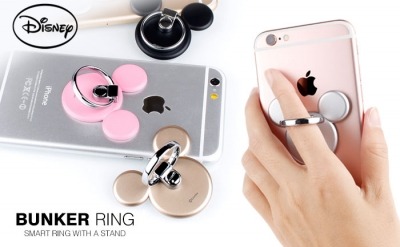 当製品は2014年に特許を取得済みの構造で、背面に貼り付けたリングがスマートフォンを持つ手の角度に合わせて360度回転し、タッチ操作をサポートします。リングを立てればスタンドになり、付属の専用ホルダーを利用すれば、壁面への取り付けも可能です。ミッキーアイコン全4色(ブラック/シルバー/ゴールド/ピンク)。価格は2,400円(税込2,592)。