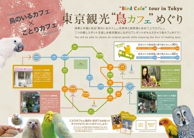 「小鳥たちを眺めながら、まったりコーヒータイム♪」をコンセプトにした「ことりカフェ表参道」(http://kotoricafe.jp/)を運営する株式会社ことりカフェ(本社:東京都港区 代表取締役 川部志穂)は、鳥のレンタルや販売も行う“フクロウを中心に鳥と遊べる鳥カフェ“「鳥のいるカフェ」を運営する株式会社鳥カフェ(本社:東京都江東区/代表取締役 明渡隆祐 http://toricafe.co.jp/)とのコラボ企画として、「ことりカフェ表参道/吉祥寺」と「鳥のいるカフェ浅草/木場」を巡るとオリジナルグッズがもらえる『東京観光 鳥カフェめぐり』を、“いいインコの日”である2015年11月15日(日)よりスタートいたします。今回、東京メトロ銀座線で「浅草」↔「表参道」、東京メトロ東西線で「木場」↔「吉祥寺」と、それぞれ乗り換えなしで巡れる、今メディアで話題の都内2大“鳥カフェ“として、新たな癒しの東京観光スポットMAP(製作:Birdstory)を各店舗に設置する等、愛鳥家はもちろん、観光目的や癒しを求める多くの方々に楽しんでいただけるような取り組みとなっています。