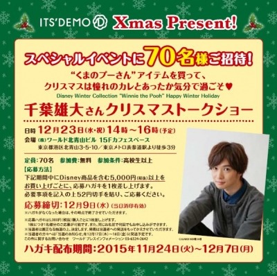 応募期間中は、「イッツデモ」と“くまのプーさん”のクリスマス限定 ディズニーデザイン商品を発売するほか、12月23日(水・祝)のトークショー当日も会場を「イッツデモ」らしく、あったかな気分になる、“くまのプーさん”のクリスマスディスプレーで演出し、スペシャルなトークショーをお楽しみ頂きます。