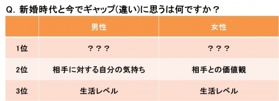 ・70%近くの人が「新婚時代と今ではギャップ(違い)がある」と回答し、さらにそのうち約73%はそのギャップが「悪くなった」と回答していました。(Q2.Q3)