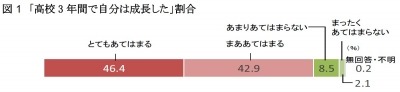1.高校生活を振り返って、「自分は成長した」と回答した高3生は約9割(「とてもあてはまる」+「まああてはまる」)。多くの高3生が成長を実感している。一方で、成長を実感していない高3生が約1割いる。