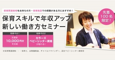 潜在保育士が、仕事に復帰しない最大の理由は「働きたいものの条件にあった求人がない」というもの。そこで、株式会社カラーズは、潜在保育士が登録すれば好きな時間に好きな時給でベビーシッターとして働ける場所として「キッズライン」を提供し、大きな成果をあげている。今回この活動を広げるために、保育資格をいかして活躍し収入をあげる方法やノウハウを提供する「あたらしい働き方セミナー」を開催、保育関連資格を持つものは無料で受講が出来、全課程修了者には先着100名に1万円の報奨金を支給する。