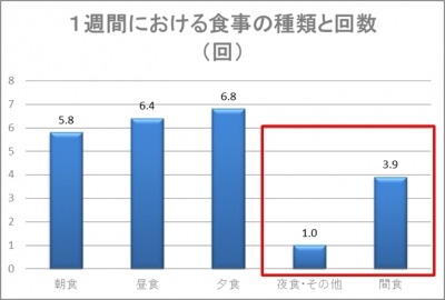 一方、食事の頻度について聞いたところ、1週間のうち朝食を食べる頻度が5.8回、昼食が6.4回、夕食が6.8回、夜食・その他が1.0回、間食が3.9回(グラフI参照)と、1日3食以上に分けて食べる習慣が広がっている様子が伺えます。