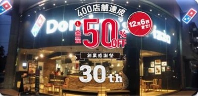 株式会社ドミノ・ピザ ジャパン(代表取締役社長:スコット・オルカー/本社:東京都千代田区、以下ドミノ・ピザ)が展開する、日本で最初のデリバリーピザチェーンドミノ・ピザは、全国400店舗を達成。創業30周年を記念して、2015年11月28日(土)~12月6日(日)の期間限定で、ネット注文でLサイズ全品が半額となる「400店舗達成!創業感謝祭」を実施いたします。
