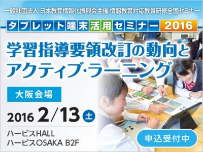 一般社団法人日本教育情報化振興会では、「学習指導要領改訂の動向とアクティブ・ラーニング」をテーマに、情報教育対応教員研修全国セミナー「タブレット端末活用セミナー2016」を、2016年2月13日(土)に大阪で開催いたします。