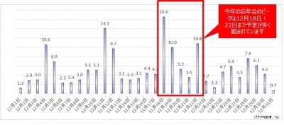 2015年度の忘年会ピークは12月18日(金)という結果となりました。12月23日が祝日となっている影響から、週末を挟み22日(火)まで、特に多くの忘年会が組まれる予定となっています。12月4日(金)から徐々に忘年会が増えており、連夜の飲み会となることも予想されます。肝活をうまく取り入れて、忘年会シーズンを乗り切りましょう。