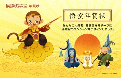 株式会社グリーティングワークス(所在地:大阪市西区、代表取締役:徳丸 博之)は、挨拶状ドットコムの年賀状印刷サイト(http://nenga.aisatsujo.jp/)にて、孫悟空を主役にした年賀状「悟空年賀状」の販売を開始しました。「悟空年賀状」は、2016年の干支である申(さる)にちなんだ年賀状として企画。猿の中で最も人気のある孫悟空を主役にし、14名のクリエイターが描いたオリジナリティ溢れる楽しい年賀状デザインとなっています。
