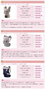 「日本人向けに設計されていることと、メッシュ部分が多いこと」(39歳女性、お子さん0歳)「おんぶの際も、フードがすぐに使用できるようなつくりになっているので、赤ちゃんも快適に眠れる」(34歳女性、お子さん0歳)「コスト、持ち運びの良さ、安定性のバランスがよい」(35歳女性、お子さん0歳)などのコメントがありました。特に「ママのからだへの負担の少なさ」「コストパフォーマンス」などの項目で高い支持を得ました。