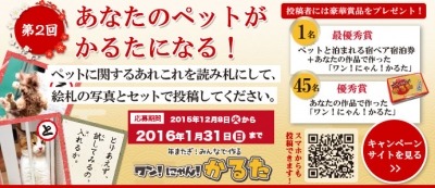 結果発表:2016年2月中旬に最優秀賞・優秀賞の選定、及び賞品当選者の抽選を行い、 「ワン!にゃん!かるた」特設ページにて最優秀賞1名及び優秀賞45名の入賞作品を発表いたします。