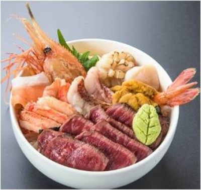 1万匹に1~2匹しか獲れない超高級魚で幻の鮭と呼ばれる“鮭児”をはじめ、特大のボタンえび、北海道の高級魚きんき、毛ガニ、ホタテ、ホタテの炙り、ウニ、北海道産黒毛和牛、と豪華食材をこれでもか!と載っけました。ガッツリお肉も海の幸も、一度に味わえるハイブリッド丼です。