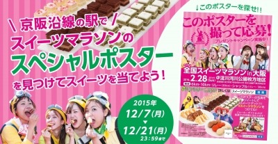 2月28日(日)に大阪大会が行われる全国スイーツマラソンでは、ただいま京阪線6駅でポスターを掲示中しています。そのポスターの中に、各駅4枚だけ、スペシャルポスターが隠れています。見つけて写真を撮って「#スイーツマラソン」のハッシュタグと一緒にツイートした方の中から、抽選で29名に、美味しいスイーツセットをプレゼントするキャンペーンを実施中!
