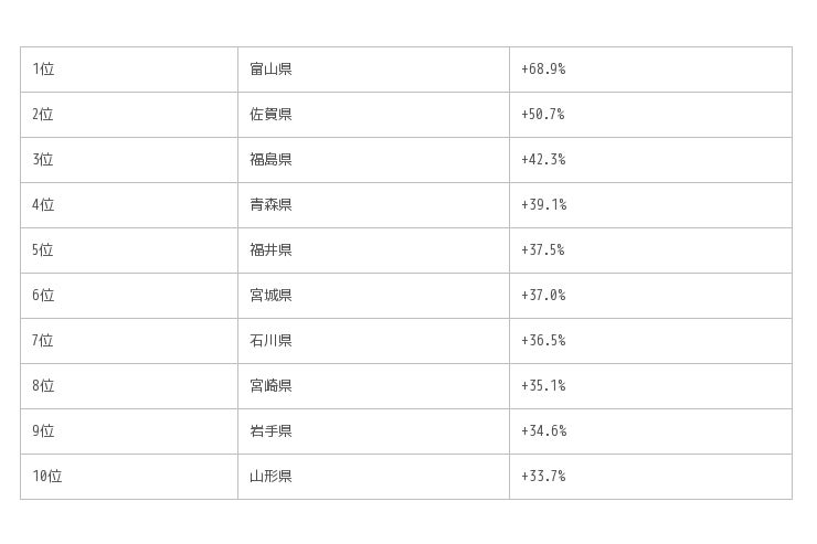 エリア別 伸び率: 1位 富山県 +68.9%・2位 佐賀県 +50.7%・3位 福島県 +42.3%(前年同期比)