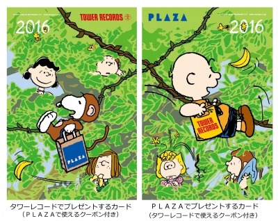 2016年の干支、申(さる)の格好をしたスヌーピーとチャーリー・ブラウンが、木のつたにぶら下がるオリジナルデザイン。PLAZA、タワーレコードそれぞれの店舗で配布する2種類のカードを合わせるとひとつのデザインが完成します。カードには互いの店舗で使えるお得なクーポン付き。クーポンは、期間中何度でも使用できます。