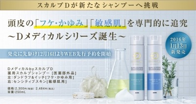 今回発売する「アンファー DメディカルbyスカルプD 薬用スカルプシャンプー」シリーズ(以下:Dメディカル)は、頭髪専門クリニックにおける患者様の薄毛と併発する症状の調査から生まれました。その症状に対して長年培った「スカルプD」のシャンプー技術を応用し、“頭皮のトラブルを改善する”ことを目的としたシャンプーシリーズです。商品ラインナップは「フケ・かゆみ用」と「敏感肌用」シャンプーの2種類となります。2016年1月13日(水)の発売に先駆け、2015年12月16日(水)よりWEB先行予約を開始いたします。