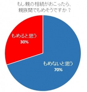 「もし親の相続が発生したときに、兄弟姉妹や親族間でもめると思いますか?」という質問に対して、「もめる」と思った人は30%、「もめない」と思った人が70%という回答結果でした。