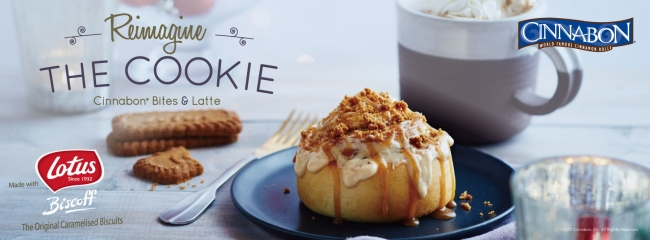 シナボンのもちもち生地で、コーヒーに良く合うビスコフ(カラメルビスケット)スプレッドをロールして焼き上げ、特製のビスコフフロスティングとビスコフクッキーで仕上げました。