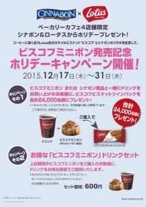 コーヒーに良く合うロータス社のカラメルビスケット”ビスコフ“とシナボンのコラボを記念して、期間中に、「ビスコフミニボン」またはシナボン商品とドリンクを一緒にお買い上げのお客様に “ビスコフビスケットツインパック”を合計24,000名様にプレゼント!