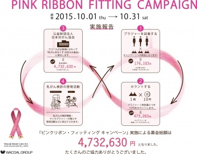 ワコールグループでは、2015年10月1日~10月31日の間、乳がんの早期発見・早期診断・早期治療支援活動である「ピンクリボン活動」の一環として、全国約2,000店舗の売場で「ピンクリボン・フィッティングキャンペーン」を実施し、キャンペーン期間中、176,103名のお客様が、合計で473,263枚のブラジャーを試着して下さいました。