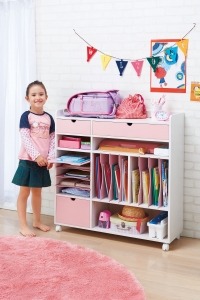 最近、お子様がリビングで勉強を行なう“リビング学習”が注目を集めています。親の目の届くところで学習することで、子供のやる気が高まる、子供の学習状況がわかる、家族のコミュニケーションが増えるといったメリットがあり、子供部屋を与えずにリビングで一緒に過ごすご家庭が増えているようです。「整理整頓上手!お片付けラック」は、リビングにぴったりの収納ラックです。教科ごとに本やノートを整理できるスペースや、文房具やメモ帳をしまえる引き出し、体操着や水着をまとめて収納できる大きめの引き出しなど、学校や習い事で必要な用品を一台にスッキリ収納できるよう設計しました。「ベルーナインテリア」では、収納ラックだけでなく、そのままデスクになる「リビングパレット」や机の上に置く「リビングで集中できる学習室」など、リビング学習に向けたアイテムも販売しています。この他にも、リボンのモチーフとピンクがキュートな「リボンキッズデスクシリーズ」などお子様の新生活に向けたアイテムを豊富に取り揃えています。
